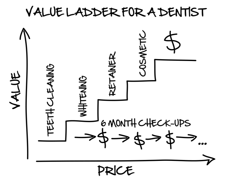 Next, the dentist will notice that some of her patients have yellow teeth and may legitimately need teeth whitening. This is further up the value ladder (step 2). Because of the massive value she just provided with the free teeth cleaning and affordable fillings, most people will naturally want to get even more value.
